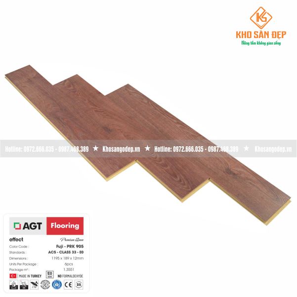 Sàn gỗ AGT 12mm PRK905 Là sàn gỗ Châu Âu chính hãng cao cấp nhập khẩu trực tiếp 100% từ Thổ Nhĩ Kỳ. Có độ dày 12mm, được tạo nên từ gỗ thông tự nhiên an toàn cho sức khỏe. Gam màu đỏ nâu bắt mắt, giúp không gian thêm ấm cúng, sang trọng.