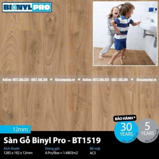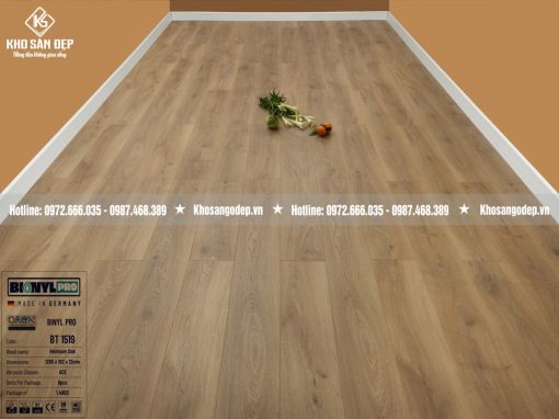 Sàn Gỗ Binyl Pro 12mm BT1519 – Sàn gỗ siêu cao cấp 12mm, bản to mang thương hiệu CHLB Đức. Gam màu nâu vàng bắt mắt, sang trọng, phù hợp với không gian rộng, nhiều ánh sáng.