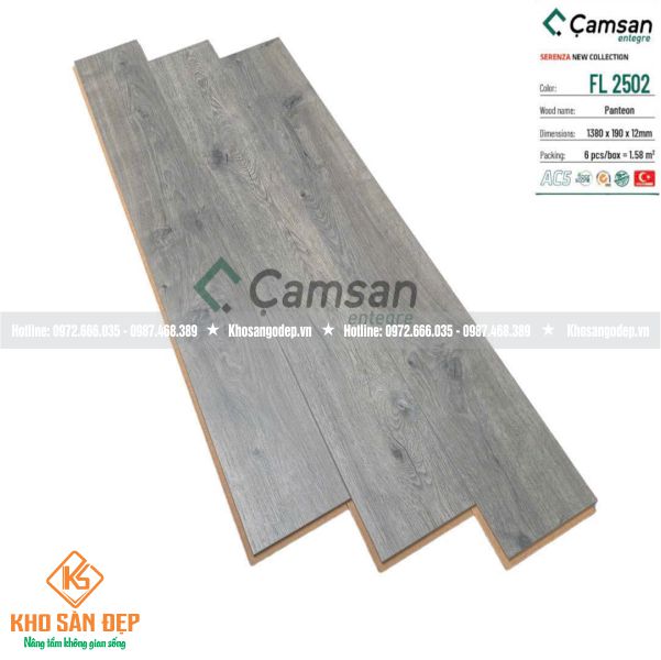 Sàn gỗ Camsan 12mm FL 2502 đây là sản phẩm sàn gỗ nhập khẩu chính hãng 100% từ Thổ Nhĩ kỳ. Gam màu ghi lông chuột hiện đại, mang hơi thở phong cách Châu Âu. Với khả năng chịu nước lên đến 1440H – Dòng sản phẩm vô cùng thích hợp với thời tiết, khí hậu Việt Nam.