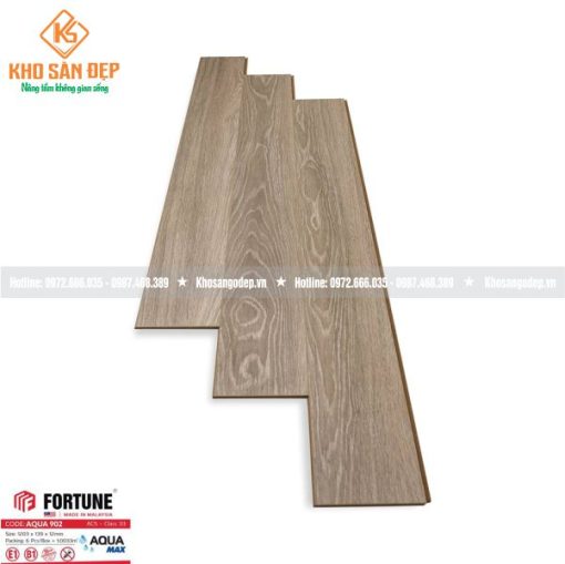 Sàn gỗ Fortune Aqua 902 có độ dày 12mm, bản nhỏ, hèm V, siêu chịu nước. Thương hiệu sàn gỗ chịu nước nổi tiếng Việt Nam. Gam màu xám nâu lạ mắt độc đáo, giúp mang lại nét mới mẻ cho không gian nội thất