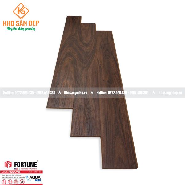 Sàn gỗ Fortune Aqua 908 có độ dày 12mm, bản nhỏ, hèm V, siêu chịu nước. Thương hiệu sàn gỗ chịu nước nổi tiếng Việt Nam. Gam màu ốc chó đậm truyền thống luôn được sự tin cậy lựa chọn của khách hàng.