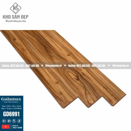 Sàn Gỗ Galamax 12mm GD6991 Là sàn gỗ có độ dày 12mm, bản nhỏ 132mm, hèm V 4 cạnh. Là sản phẩm được sản xuất tại Việt Nam nên nó có giá thành tương đối cạnh tranh so với những sản phẩm cùng chất lượng.