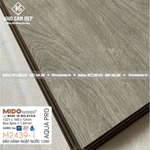 Sàn gỗ Mido Wood M2439-1 có độ dày 12mm, bản nhỡ, hèm V, siêu chịu nước. Cốt HDF nhập khẩu Malaysia. Thương hiệu sàn gỗ chịu nước nổi tiếng Việt Nam. Gam màu ghi độc đáo, phù hợp với những không gian nội thất nhỏ, thiếu ánh sáng.