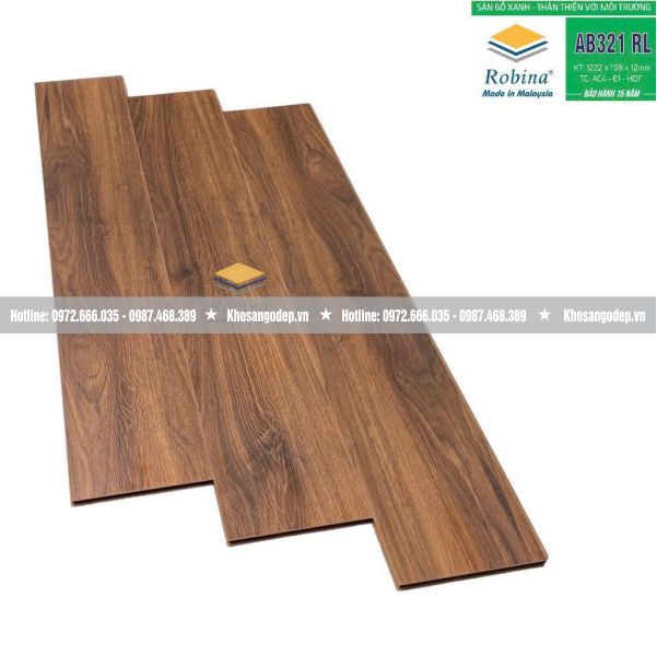Sàn gỗ Robina AB321RL – BT có độ dày 12mm, bản to, hèm phẳng – siêu chịu nước – Nhập khẩu trực tiếp từ Malaysia. Tông màu óc chó hiện đại mang đến không gian vô cùng ấm áp, sang trọng.