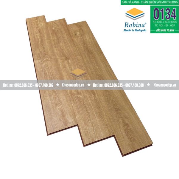 Sàn gỗ Robina O134 Có gam màu vàng sồi, trên mặt gỗ chia vân giả tự nhiên. Là Sàn gỗ Made in Malaysia có độ dày 8mm, bản to 193mm, hèm phẳng. Phù hợp lát với những công trình có mặt nền tương đối bằng phẳng.