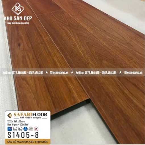 Sàn gỗ Safari S1405-8 nằm trong bộ sưu tập ván sàn Safari được sản xuất trên dây chuyền công nghệ hiện đại nhất. Cốt gỗ HDF xanh, có khả năng chống ẩm cao. Giá thành sản phẩm phù hợp với nhiều khách hàng, là phân khúc khá của thị trường sàn gỗ. Với gam màu cánh dán hiện đại, mang hơi thở Châu Âu, được rất nhiều khách hàng trẻ lựa chọn.