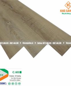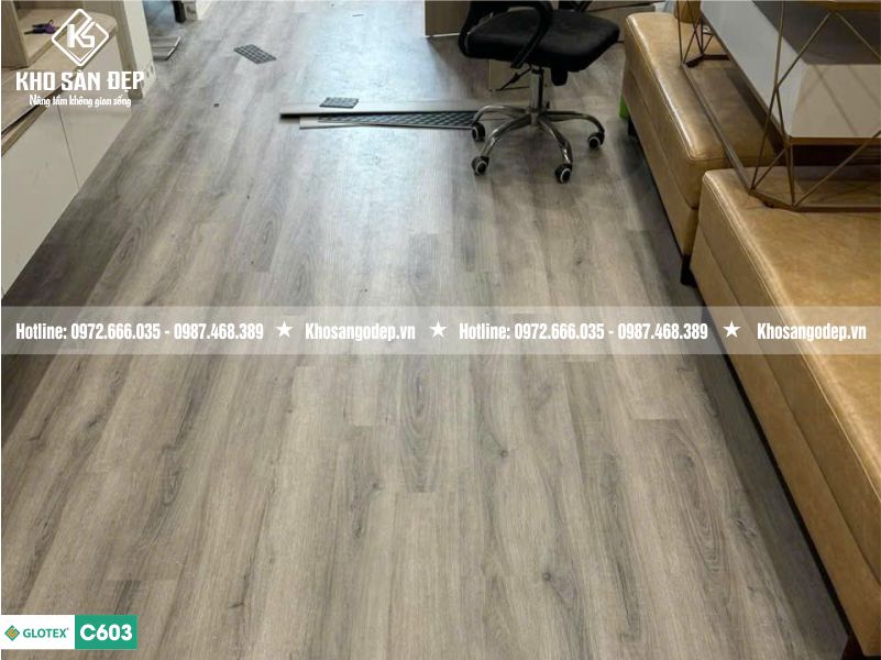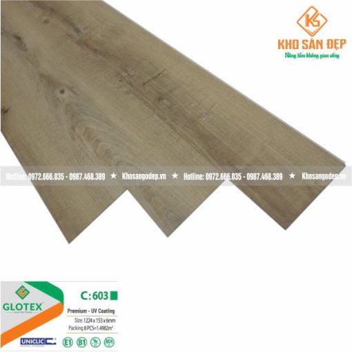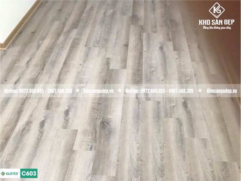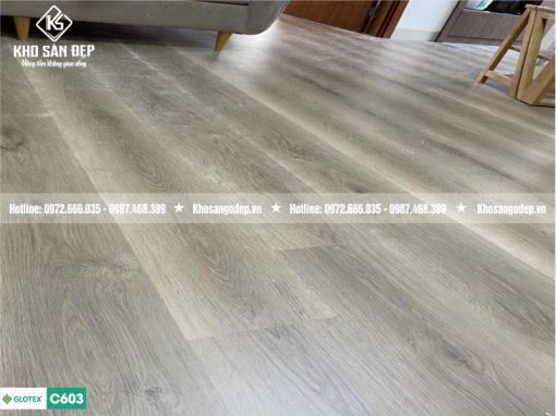 Sàn nhựa Glotex C603 với gam màu nâu vàng trắng có độ dày 6mm được sản xuất trên dây chuyền công nghệ hiện đại. Dựa vào lợi thế tận dụng nhân công nhà máy tại Việt Nam, nên chất lượng tốt, giá thành rẻ. Sàn nhựa vân gỗ tự nhiên có khả năng chịu nước rất tốt phù hợp với thời tiết và khí hậu của Việt Nam