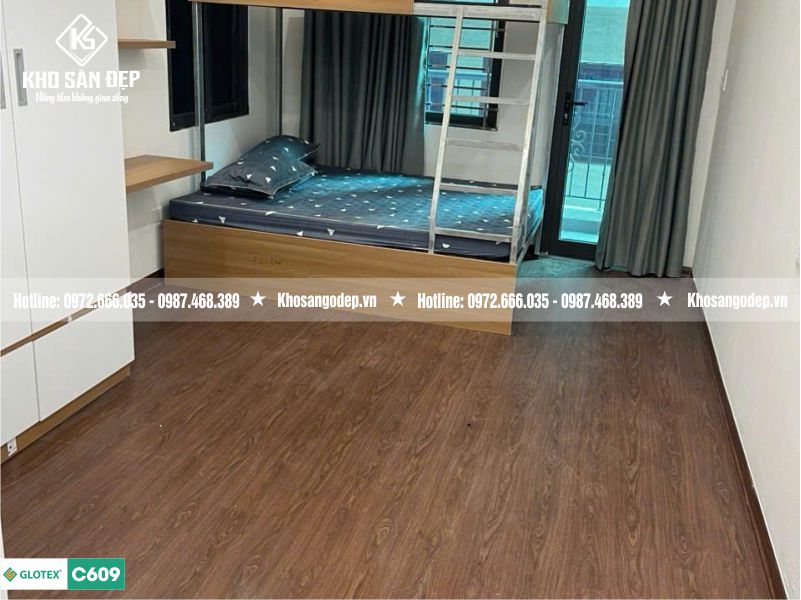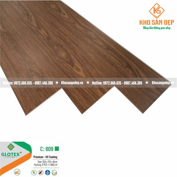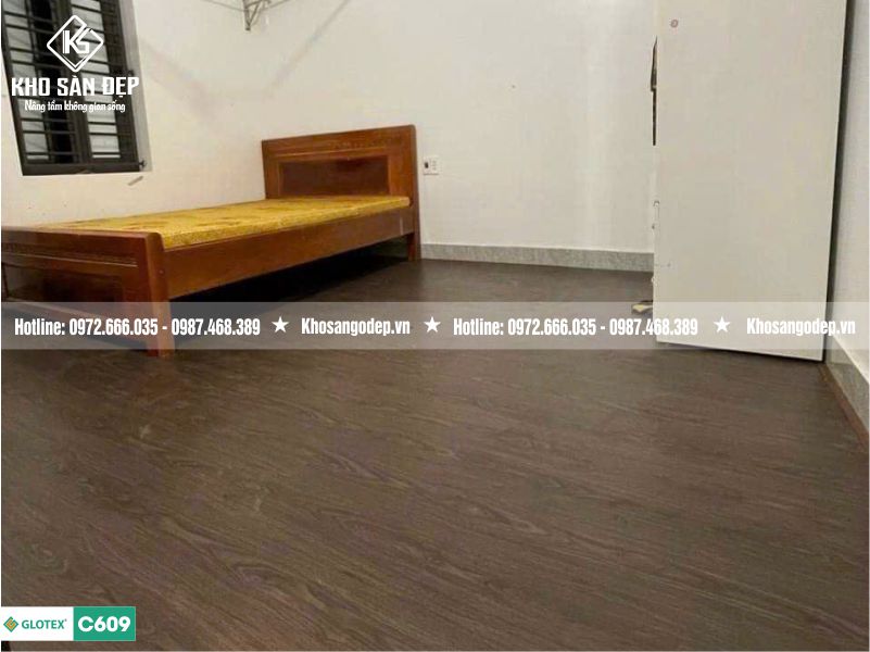 Sàn nhựa Glotex C609 có tông màu óc chó đậm, thu hút. Sàn nhựa được sản xuất tại Việt Nam dựa trên công nghệ tiên tiến nhất hiện nay. Siêu chịu nước, phù hợp với những nơi có độ ẩm cao.